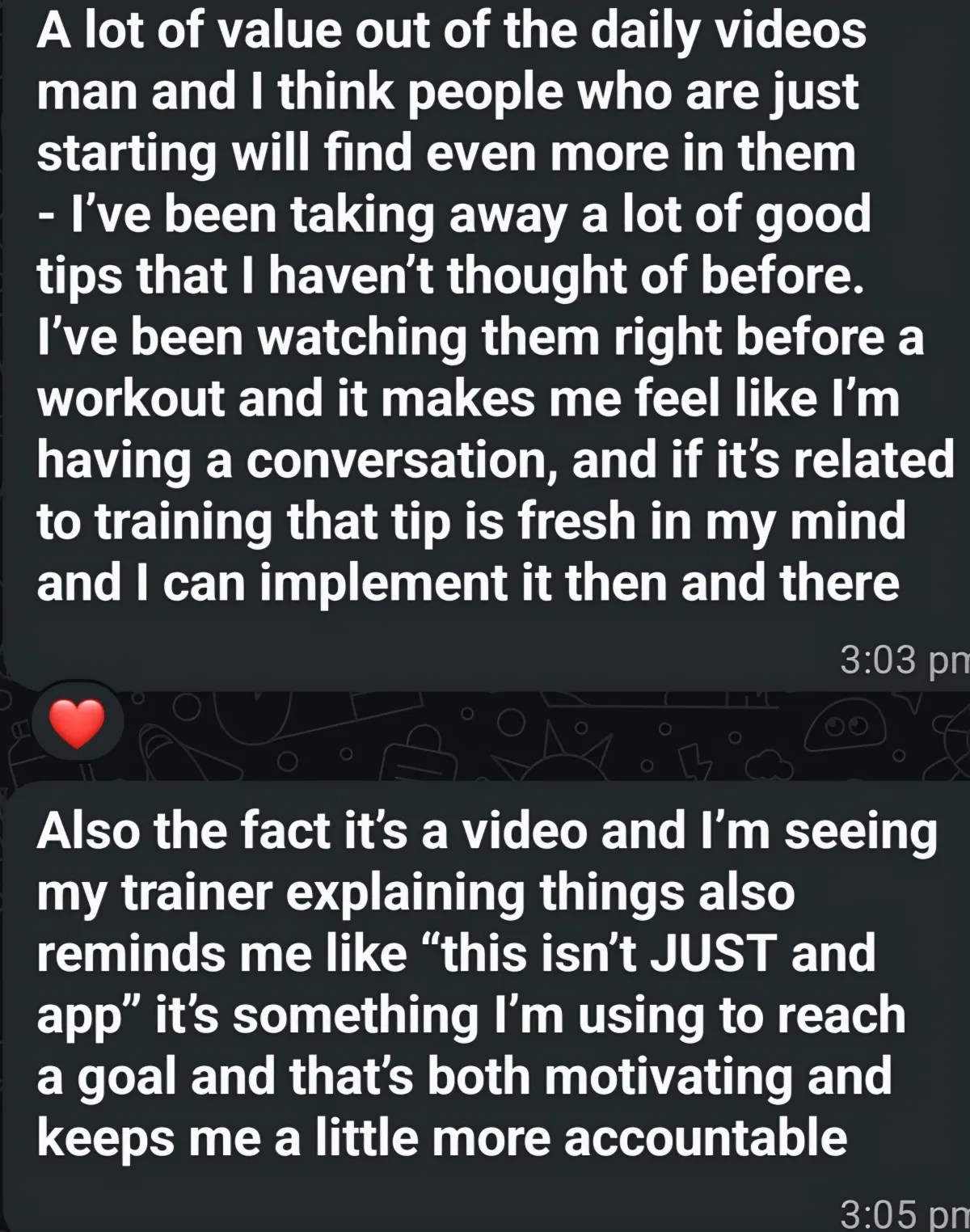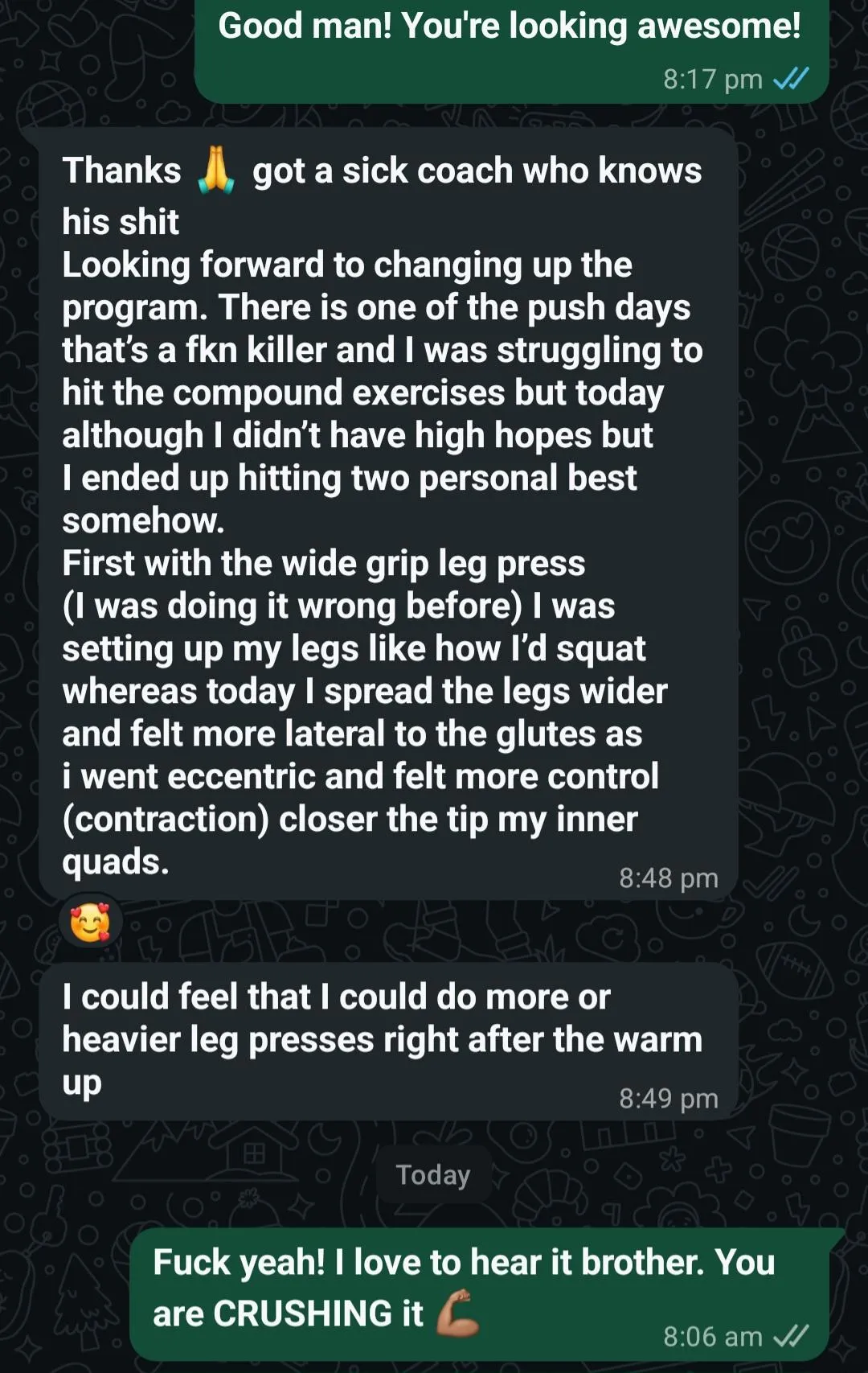 Yes - every plan is built around you. Your goals, training experience, schedule, and lifestyle shape everything we do. You’ll get one-on-one support, weekly check-ins, daily motivational/educational videos and ongoing adjustments to make sure the plan fits your life and delivers results.