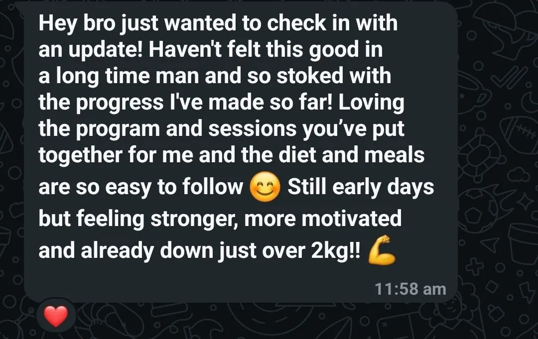 The Reset & Rebuild system runs for 12 weeks - enough time to build momentum, reset your structure, and see dramatic change. I've had clients lose 10-15 kilos in that time, but results always depend on your effort and consistency. If your goal’s bigger, we’ll map out the long game so you can keep progressing sustainably without burning out.